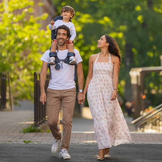 For our smallest users (approx. 6 – 10 months), the MiniMeis has an optional shoulder strap that can be used for extra support and safety. With this strap the child is secured with a patented 9-point harness. See our starter guide for more info. The MiniMeis G4 is equipped with a patented weight distribution system that allows the child to sit on an elevated arch, avoiding direct pressure on the adult’s neck, shoulders and collarbone. Parents only concern is to be aware of obstacles above their head, which would also be the case when carrying your child on the shoulders without MiniMeis.